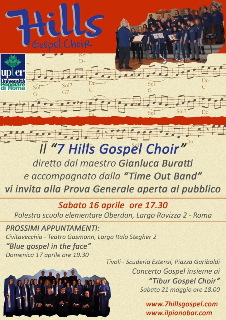 Prova generale aperta al pubblico per il coro Gospel 7 HILLS, sabato 16 aprile alle ore 17.30 nei locali della Palestra della Scuola Elementare Oberdan a Monteverde, in Largo Ravizza 2 per testare e rifinire i brani che eseguirà il giorno seguente al Nuovo Gassmann di Civitavecchia in favore della Croce Rossa. Come sempre accompagnato dalla Time-Out band, il coro torna in pubblico per la prima volta nel corso del 2011 dopo un periodo intenso di prove, lontano dagli impegni ufficiali.
