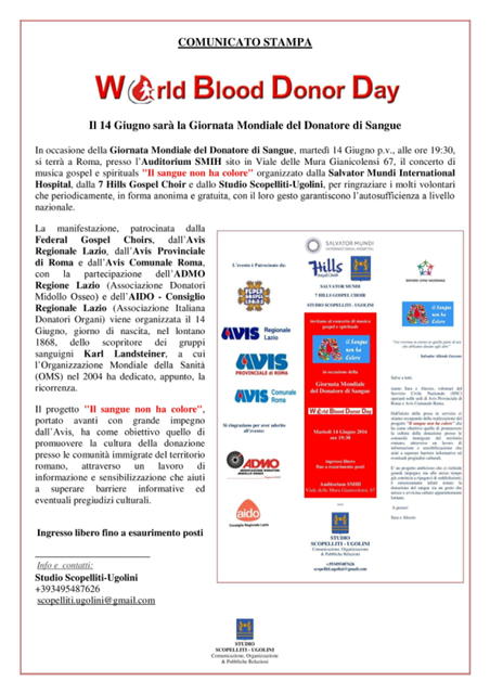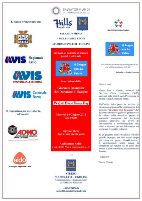 In occasione della Giornata Mondiale del Donatore di Sangue, martedì 14 Giugno p.v., alle ore 19:30, si terrà a Roma, presso l’Auditorium SMIH sito in Viale delle Mura Gianicolensi 67, il concerto di musica gospel e spirituals "Il sangue non ha colore" organizzato dalla Salvator Mundi International Hospital, dal 7 Hills Gospel Choir e dallo Studio Scopelliti-Ugolini, per ringraziare i molti volontari che periodicamente, in forma anonima e gratuita, con il loro gesto garantiscono l’autosufficienza a livello nazionale.