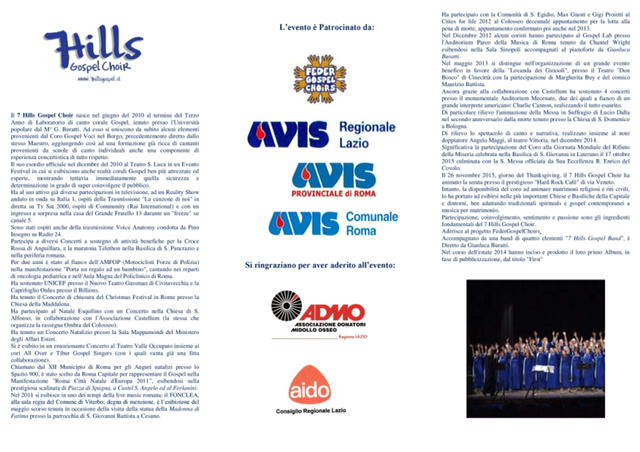 La manifestazione, patrocinata dalla Feder Gospel Choirs, dall’Avis Regionale Lazio, dall’Avis Provinciale di Roma e dall’Avis Comunale Roma, con la partecipazione dell’ADMO Regione Lazio (Associazione Donatori Midollo Osseo) e dell’AIDO - Consiglio Regionale Lazio (Associazione Italiana Donatori Organi) viene organizzata il 14 Giugno, giorno di nascita, nel lontano 1868, dello scopritore dei gruppi sanguigni Karl Landsteiner, a cui l’Organizzazione Mondiale della Sanità (OMS) nel 2004 ha dedicato, appunto, la ricorrenza.