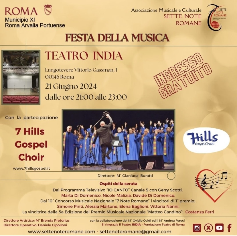 Il 21 giugno, per celebrare l'inizio dell'estate, il Teatro India - Roma, ha accolto una serata indimenticabile di musica, con ingresso gratuito. Gli straordinari musicisti dell'Associazione Musicale e Culturale Sette Note Romane e il 7 Hills Gospel Choir hanno incantato il pubblico con le loro performance.